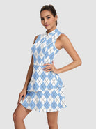 Step up your sporty style with our blue sleeveless dress, showcasing a timeless checkerboard print. Featuring a stand collar and convenient quarter-zip, it offers both coverage and easy wear. Made from soft, stretchy, breathable, and quick-drying fabric, it keeps you comfortable and cool during any activity. Equipped with built-in shorts and pockets, this blue checkerboard dress is perfect for golf, tennis, pickleball, or casual outings.