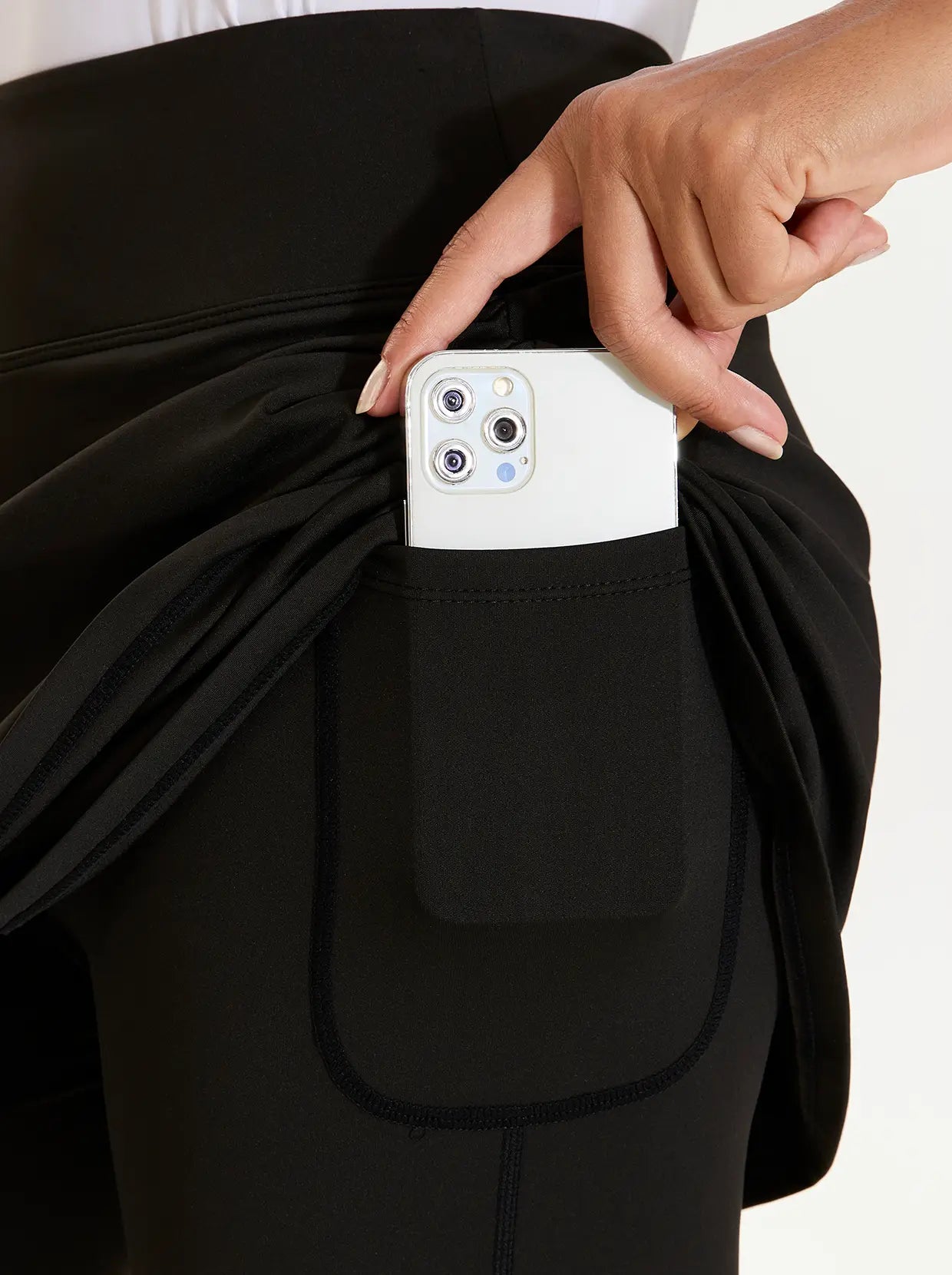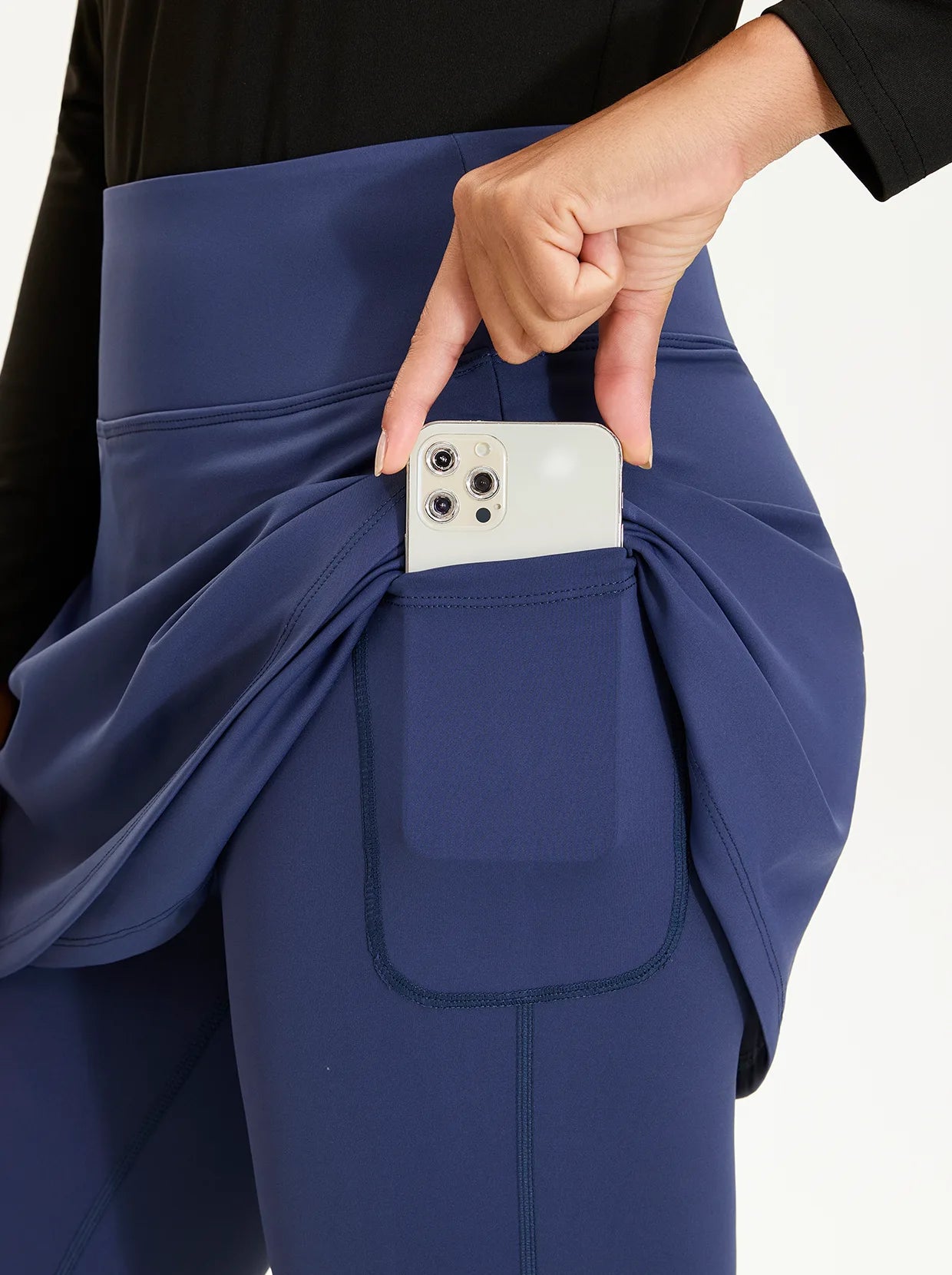 Move with confidence in our cropped leggings with a playful crossover hem and pleated skirt. Designed for both style and performance, they feature a comfortable elastic waistband and handy inner pockets. The fabric offers 4-way stretch and is both moisture-wicking and breathable. Available in black, blue, and grey, they're perfect for golf, tennis, pickleball, or everyday wear.