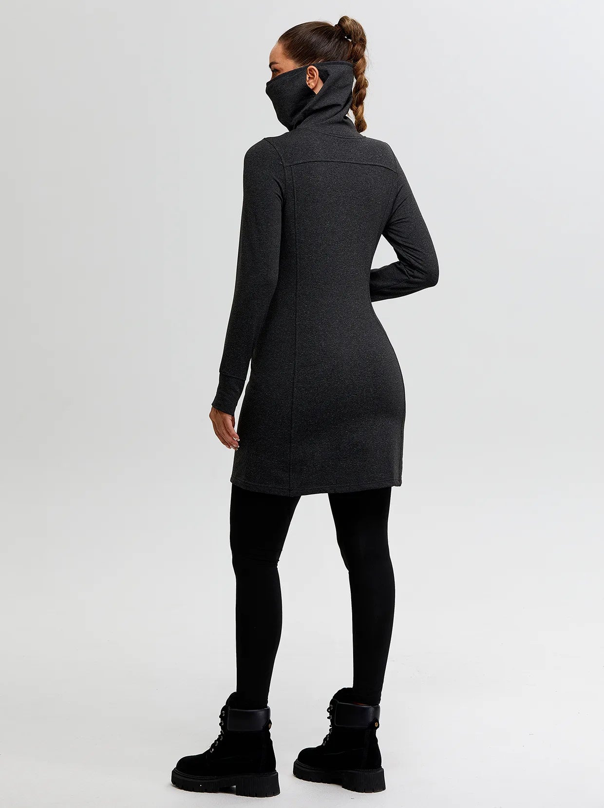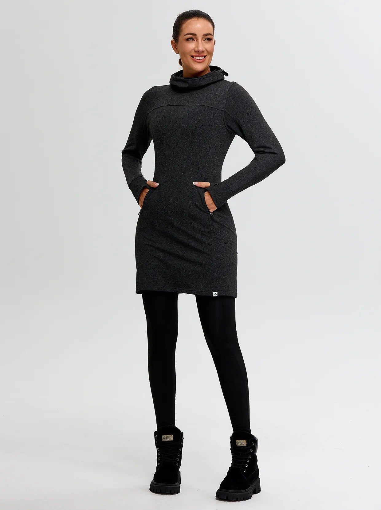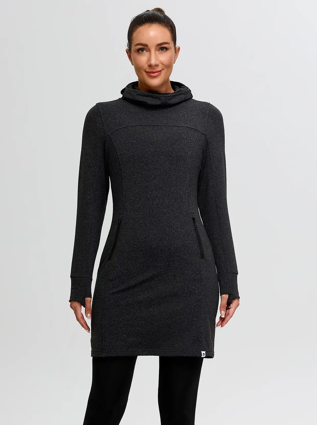The Cowl Neck Long-Sleeve Fleece Dress blends style and functionality. Made from soft fleece, it offers ultimate comfort. Convenient pockets provide easy storage, while thumbholes keep the sleeve in place and provide added warmth. The cowl neck can be looped over the ears to serve as a face mask, keeping out the wind and retaining warmth.