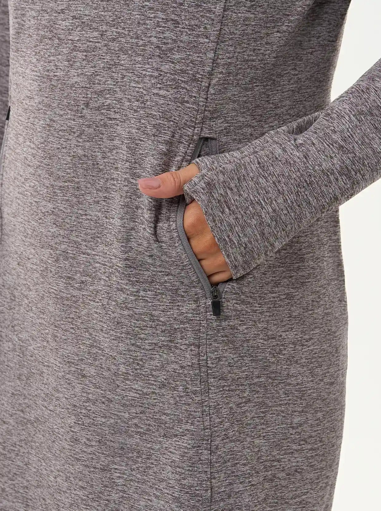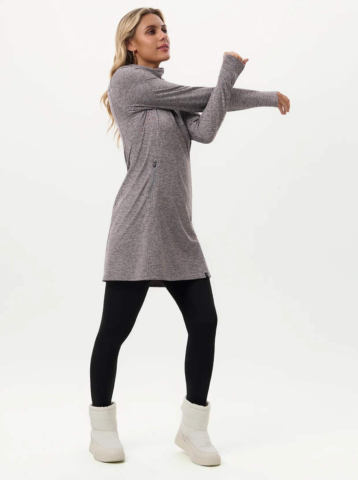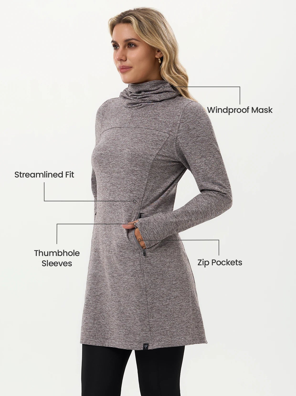 The Cowl Neck Long-Sleeve Fleece Dress blends style and functionality. Made from soft fleece, it offers ultimate comfort. Convenient pockets provide easy storage, while thumbholes keep the sleeve in place and provide added warmth. The cowl neck can be looped over the ears to serve as a face mask, keeping out the wind and retaining warmth.
