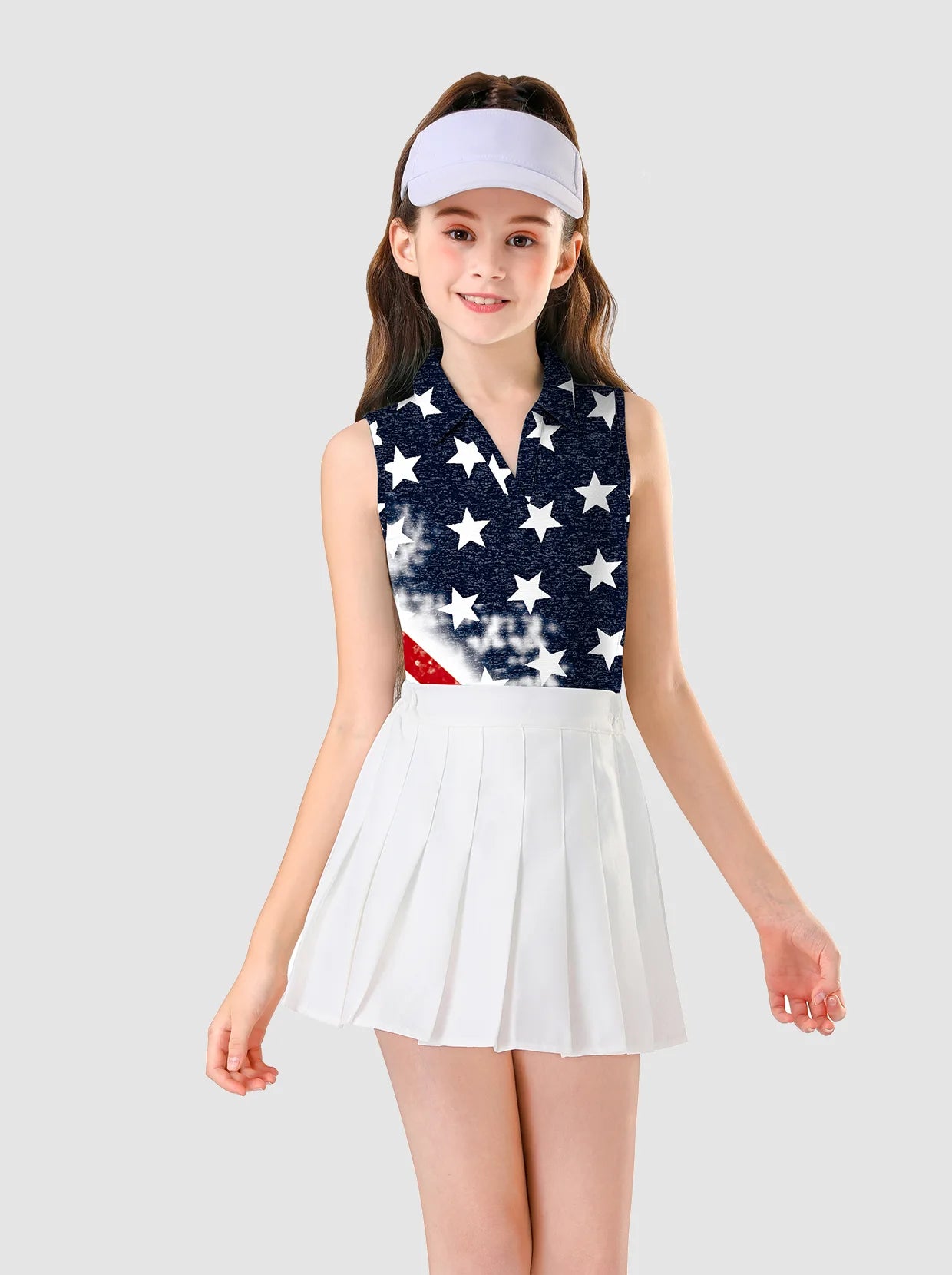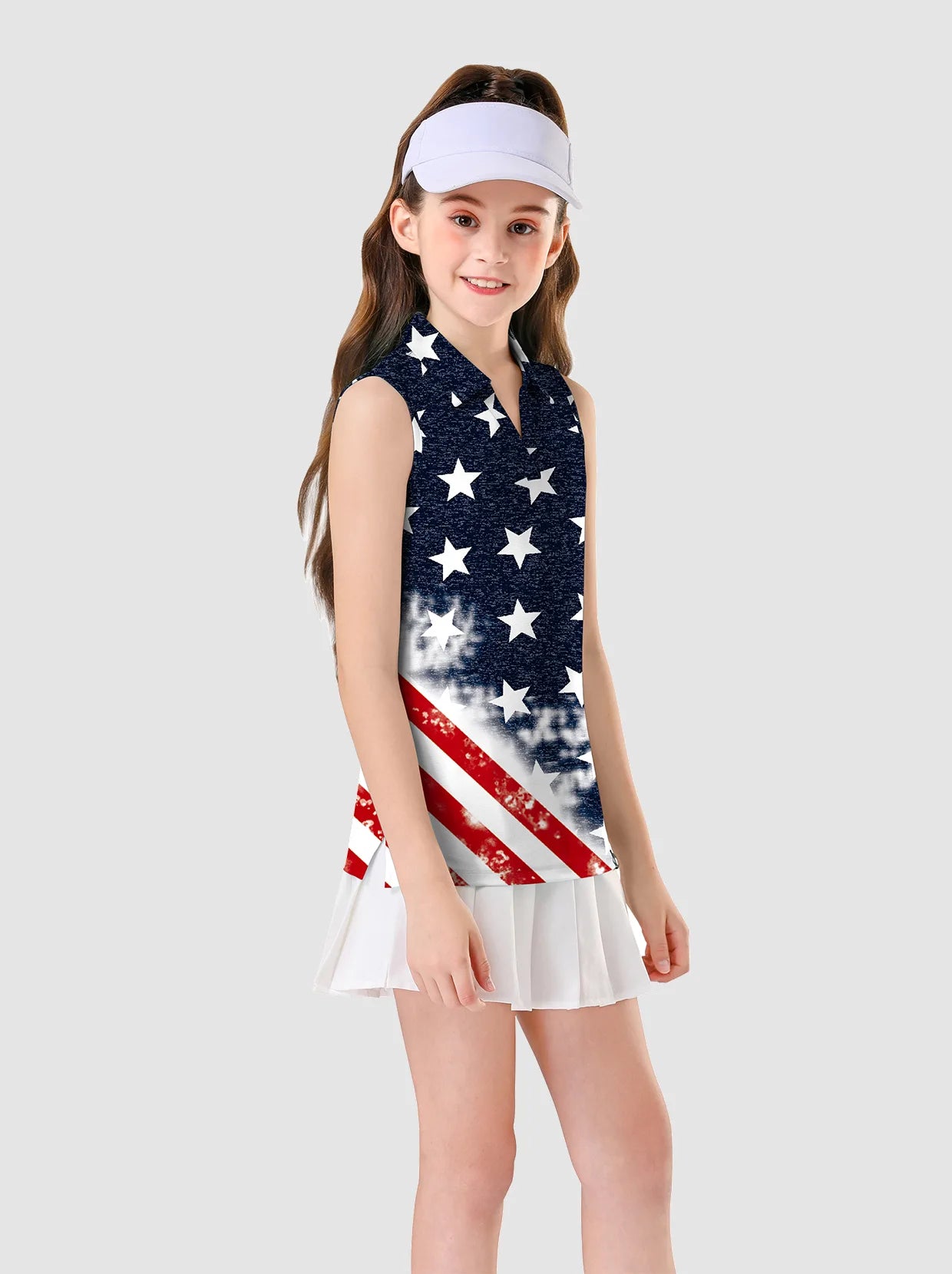 Girls Blue Flag Pattern V-neck Sleeveless Polo Shirt
