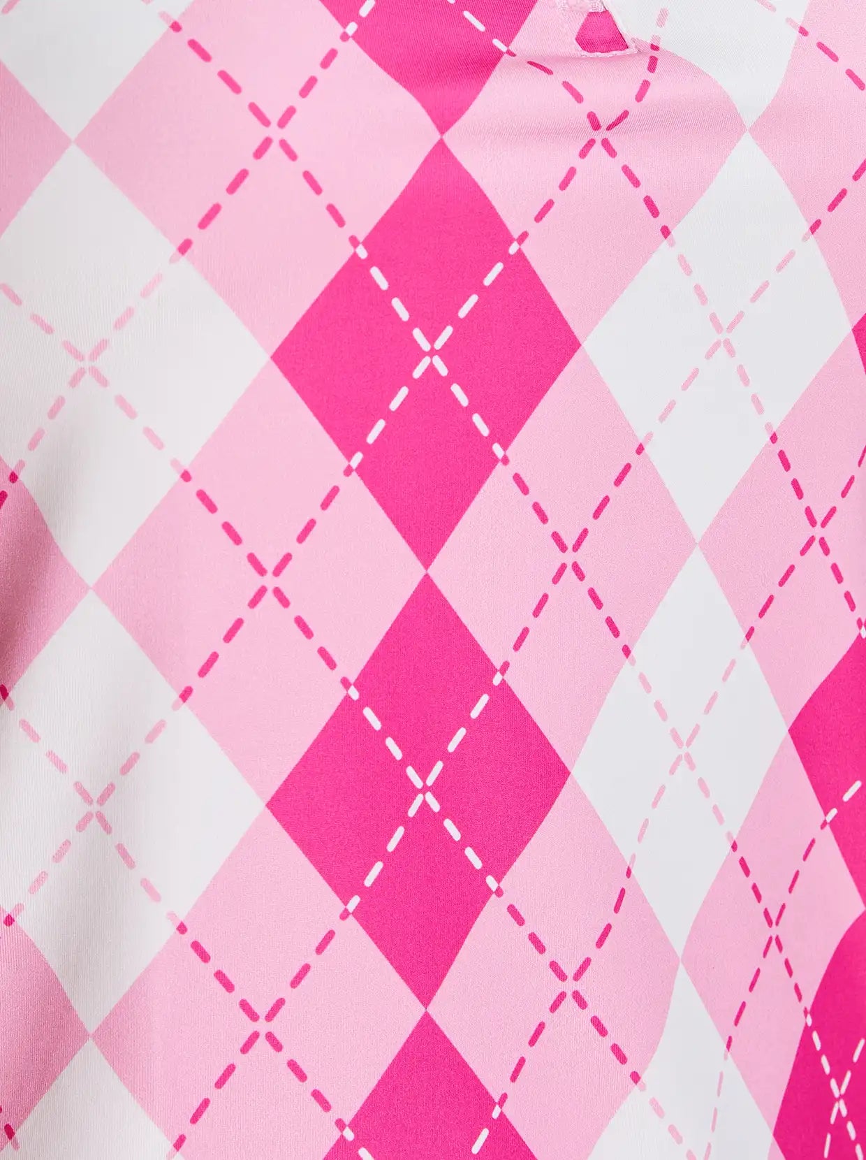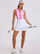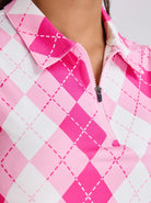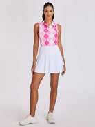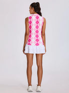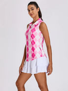Pink Checkerboard Quarter-zip Sleeveless Polo Shirt For Women