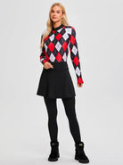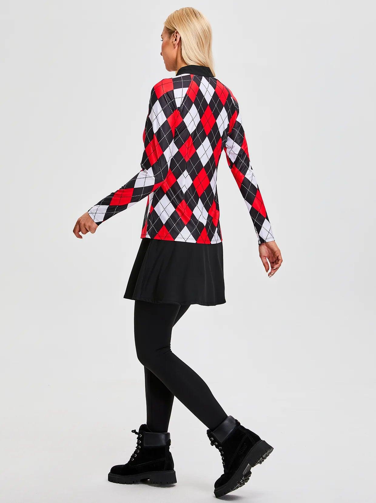 Red and Black Argyle Quarter-zip Long-sleeve Polo Shirt for Women