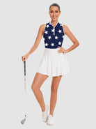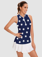 Created with the active lifestyle in mind, this shirt features a stylish star pattern and is made from a fabric blend that is moisture-wicking, breathable, and stretches in all directions, providing ultimate comfort during physical activities. The collarless, quarter-zip design adds a touch of sporty-chic, making it perfect for a variety of occasions, from the golf course to your daily workout routine. Whether you're playing golf, tennis, pickleball, or simply running errands, this racerback sleeveless shirt is the ideal choice for a fashionable and functional look.