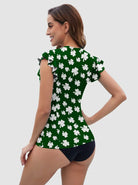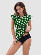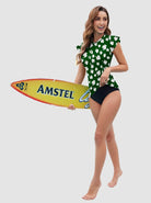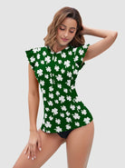 Perfect for all your water adventures, our White Shamrock Quarter-zip Ruffled Sleeveless Rash Guard is designed to keep you comfortable and stylish. Made with moisture-wicking and breathable materials, this rash guard is perfect for active days by the water. With a stretch fabric and sleeveless design, it offers maximum comfort, while the green and yellow shamrock pattern adds a touch of flair to your beach look. Stay cool while staying stylish with our versatile rash guard - perfect for surfing and other water activities.