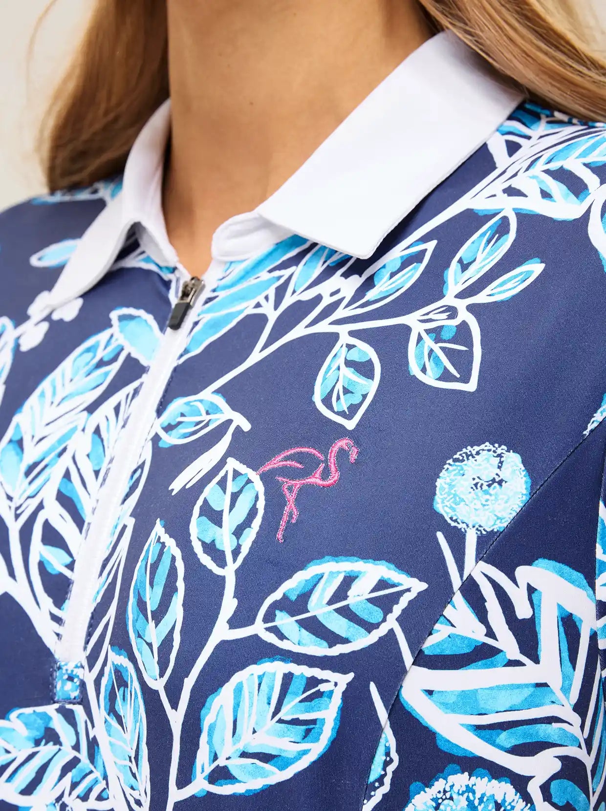 - Blue and white Petal Prelude Pattern with Pink Embroidery Flamingo